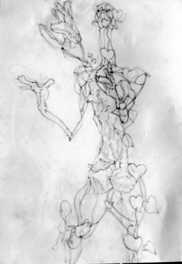 - « Les volutes de feuilles, aux ombres arrondies et veloutées, contrastent avec les longs fils de fer qui tracent à grand traits effilés et vigoureux la structure du pantin.