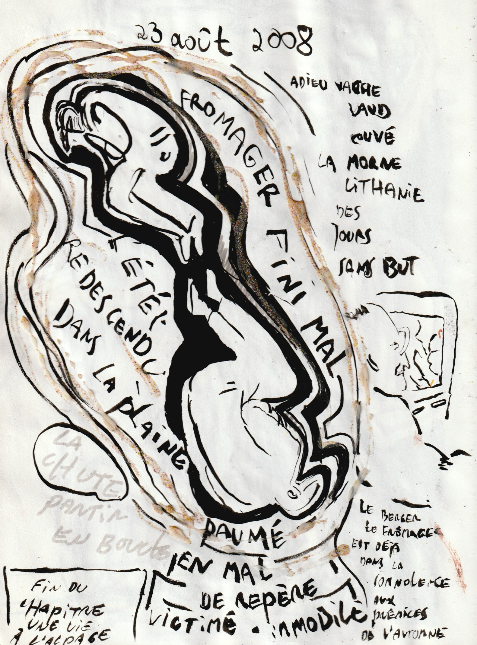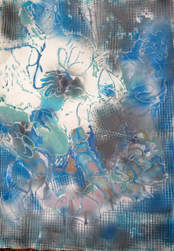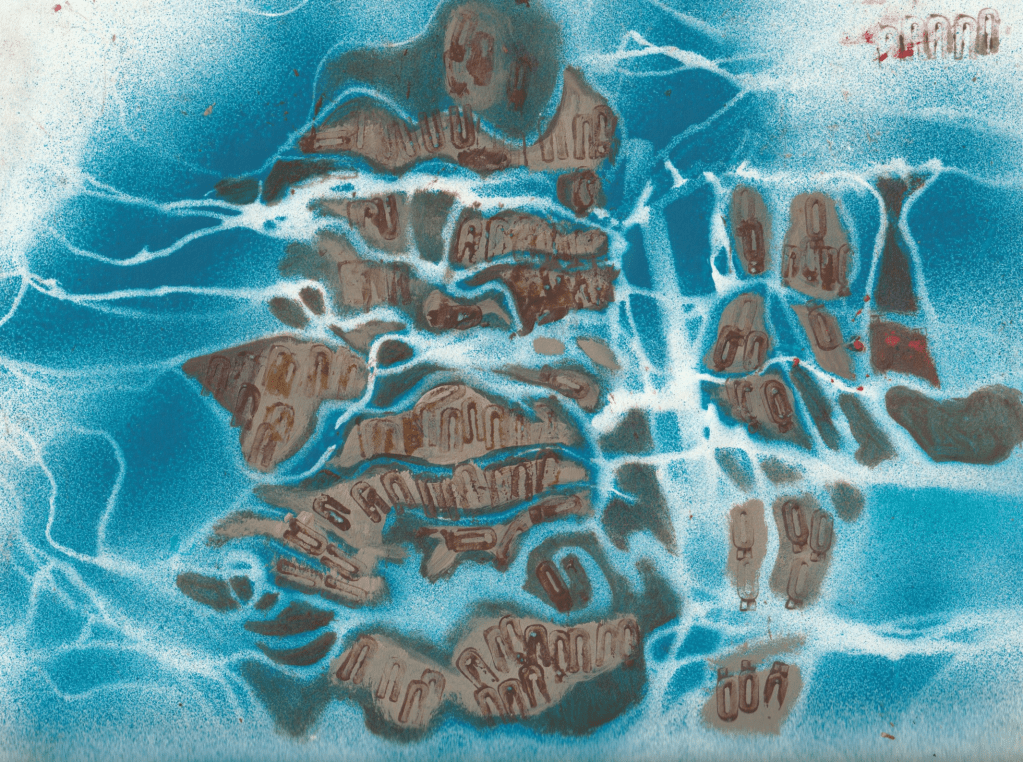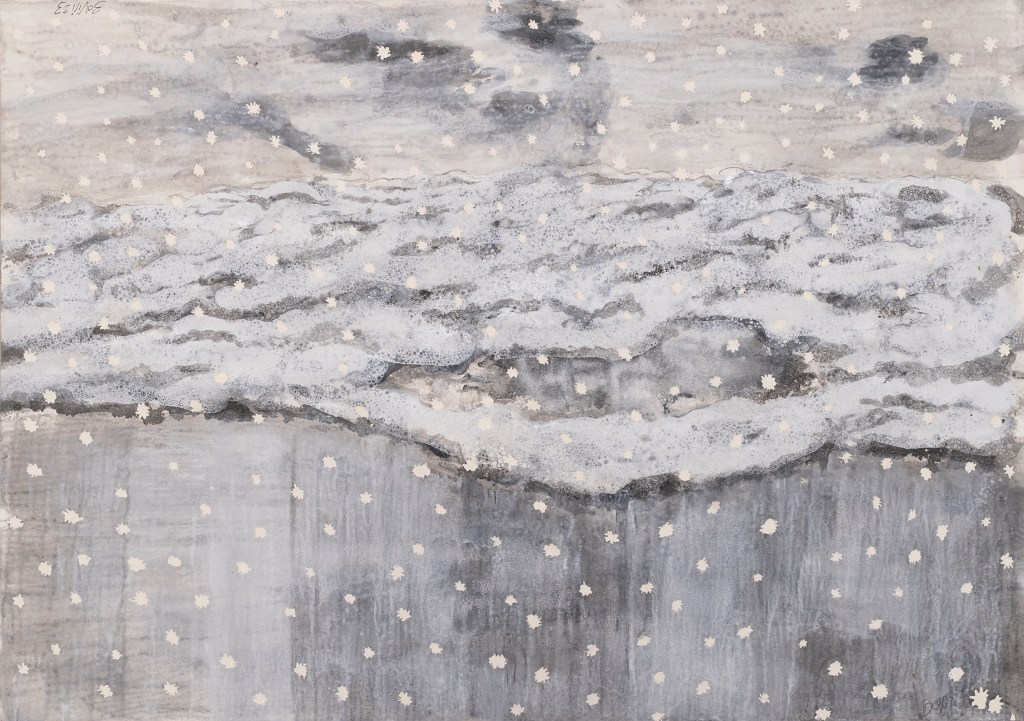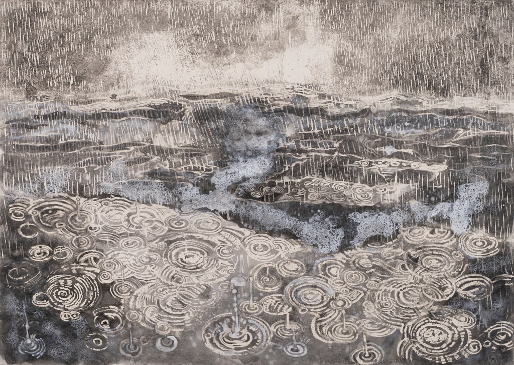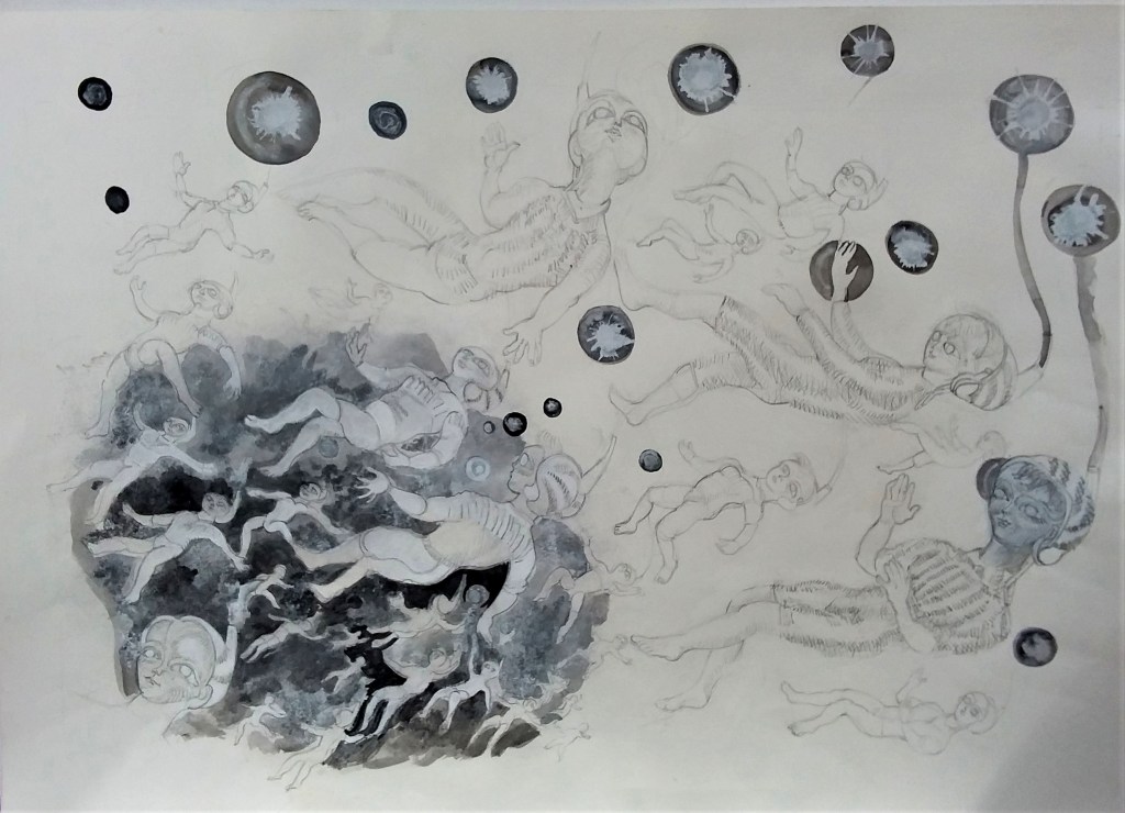 - aux surface plus rêches des planétoïdes caillouteux, aux miasmes évanescents, d’univers vaporeux et mélancoliques, tout est prétexte à expérimenter divers matériaux , divers médiums : encre de chine , bulle de savon, sable, gros sel, gouache, de mine de plomb, pigments.