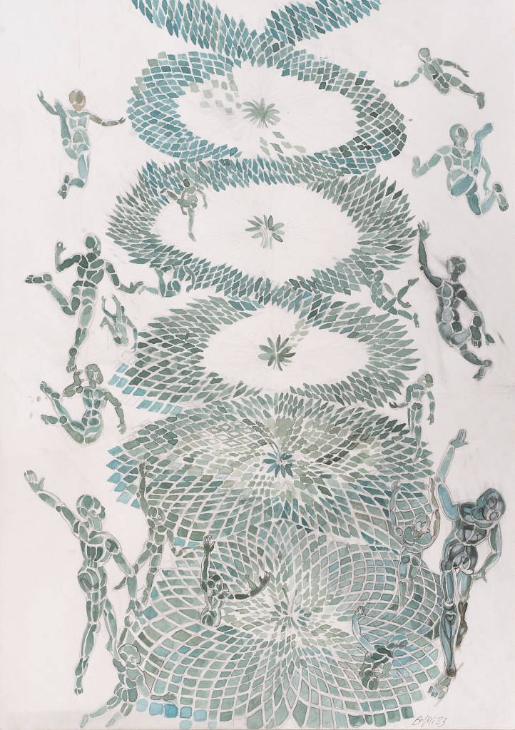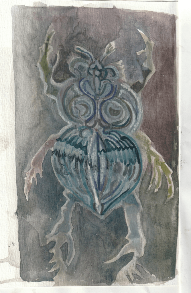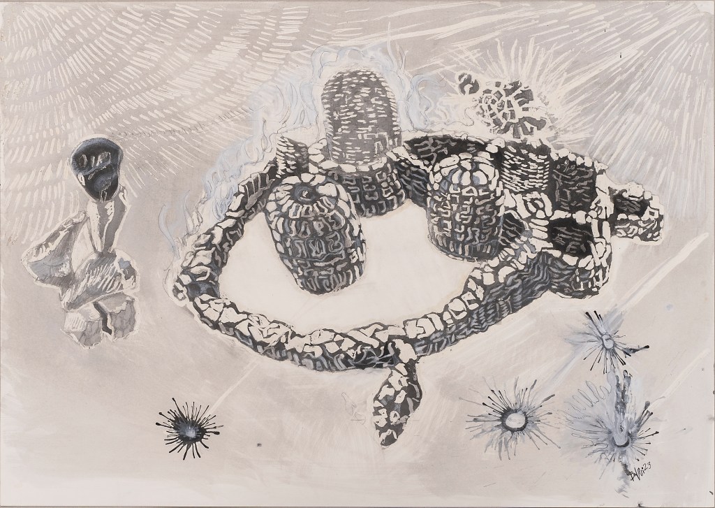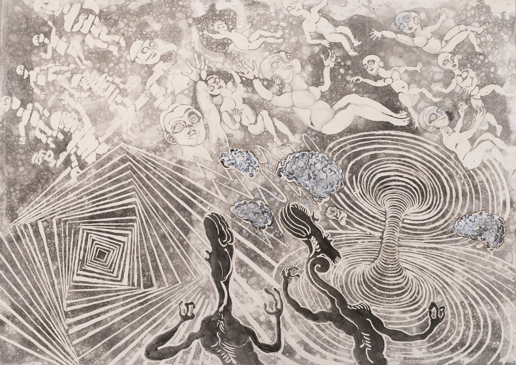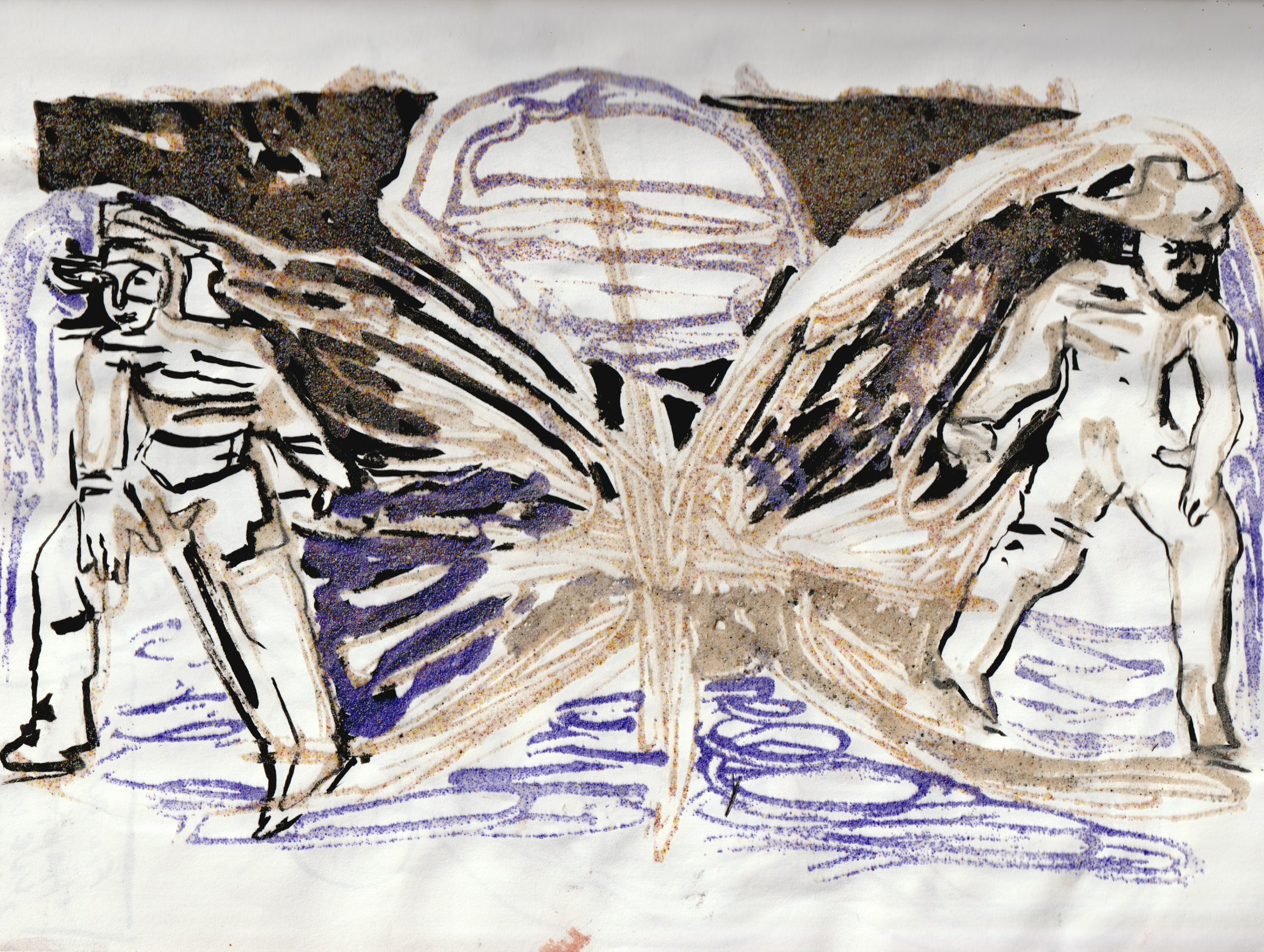 - aux surface plus rêches des planétoïdes caillouteux, aux miasmes évanescents, d’univers vaporeux et mélancoliques, tout est prétexte à expérimenter divers matériaux , divers médiums : encre de chine , bulle de savon, sable, gros sel, gouache, de mine de plomb, pigments.
