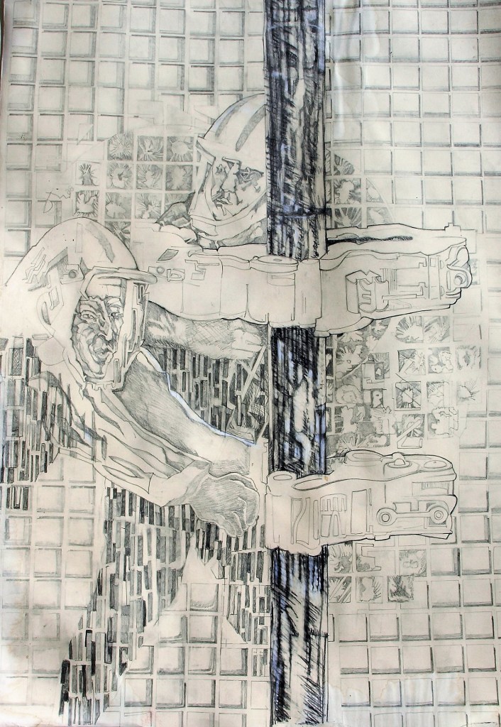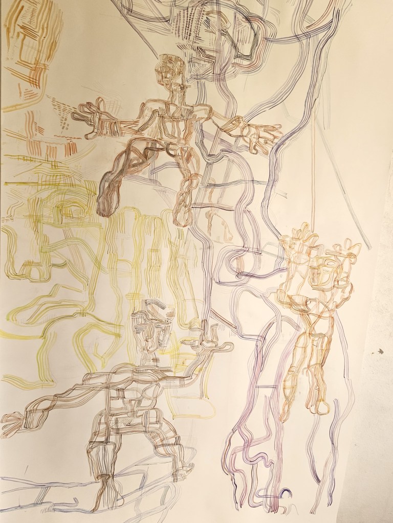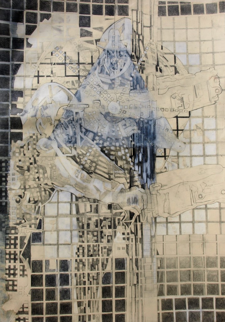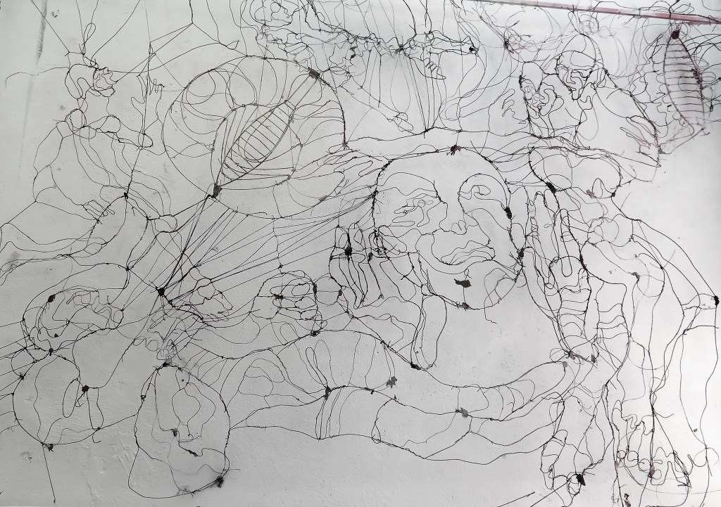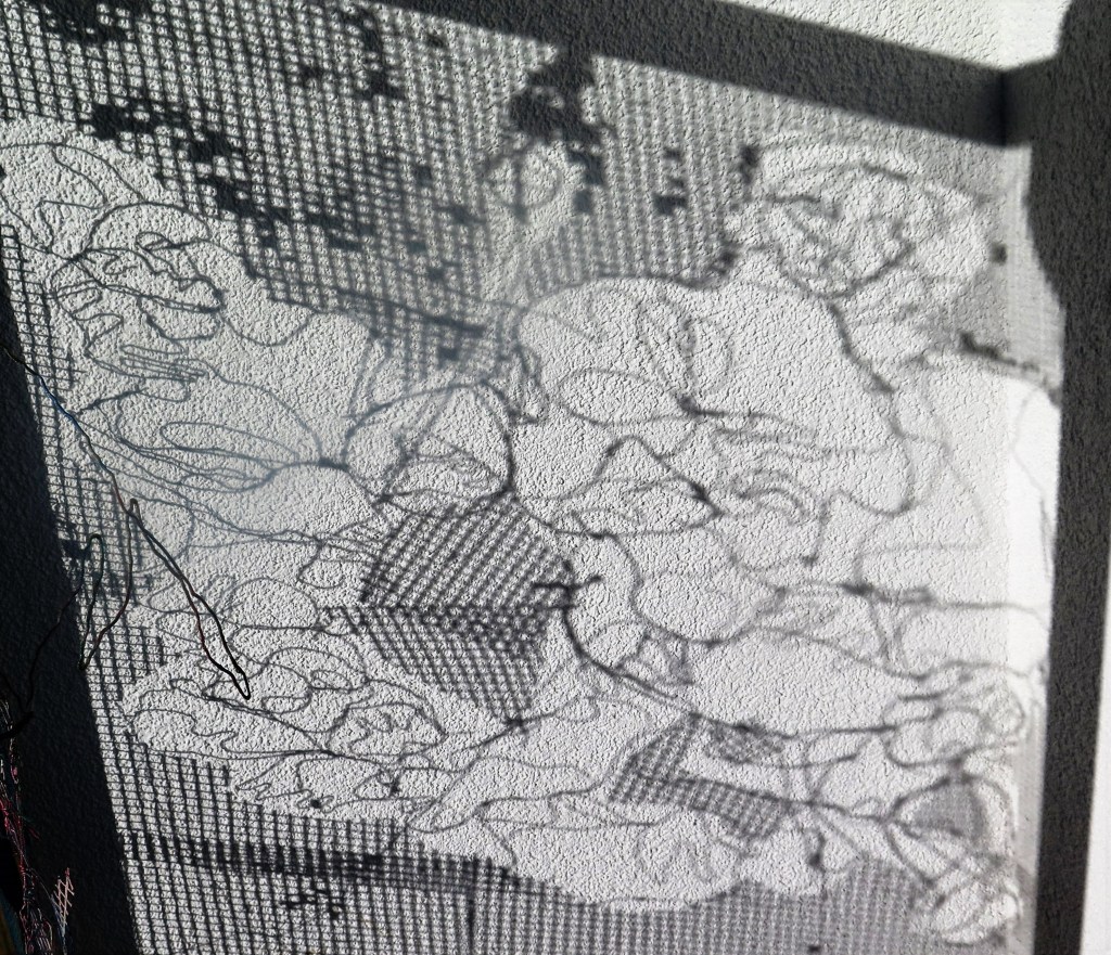 | Les artefacts métalliques interrogent ma pratique, de quelle manières mon intentions de départ va être chahutée, les lignes et les traits « policés » de l’esquisse vont être transformé par l’influx nerveux des fils de fer. Mon crayon suis la trace de ces trames de fil en ombre projetée sur la toile ou sur le papier, |