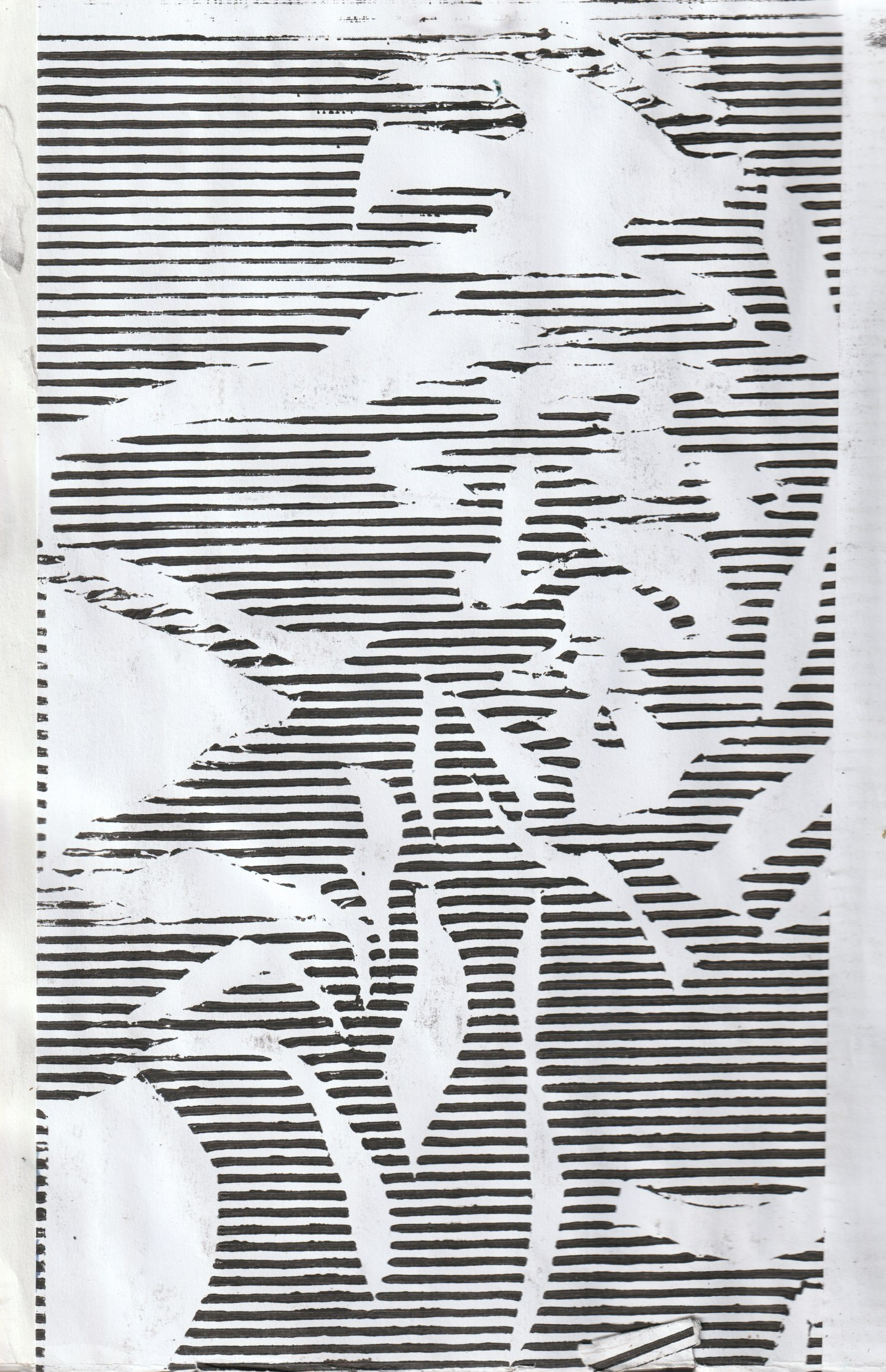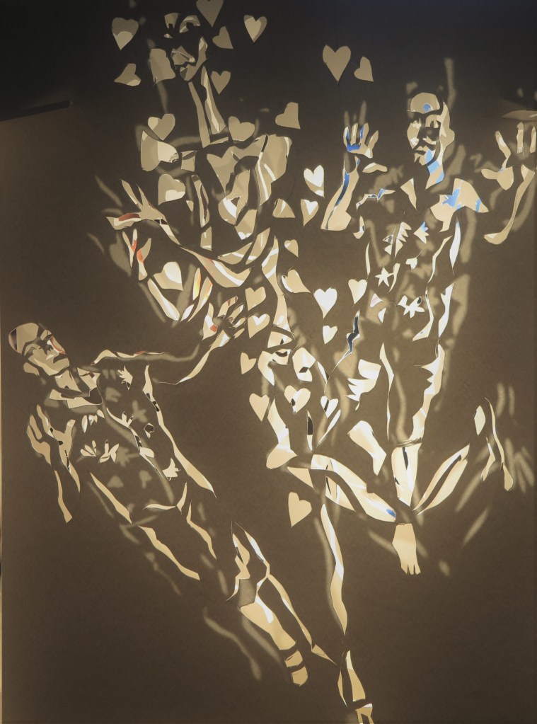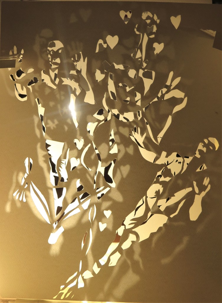 - La lumière traverse des chablon découpés, ces persiennes dentelées font apparaître en sous couches les fromes les lignes du dessin, apparaissent en une jeu de vitrail, une image polarisée comme un double en négatif
