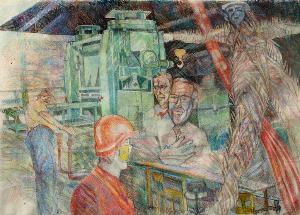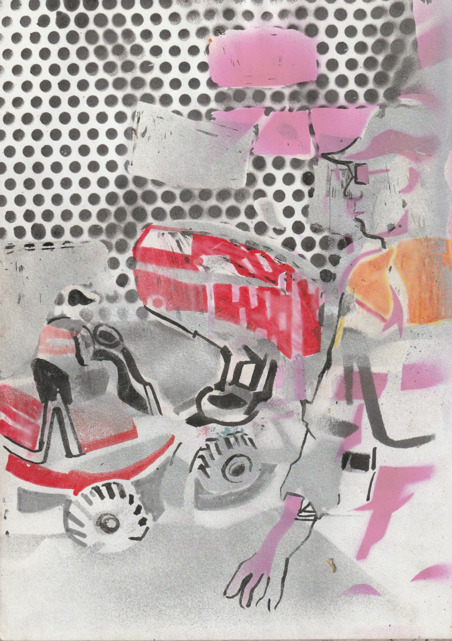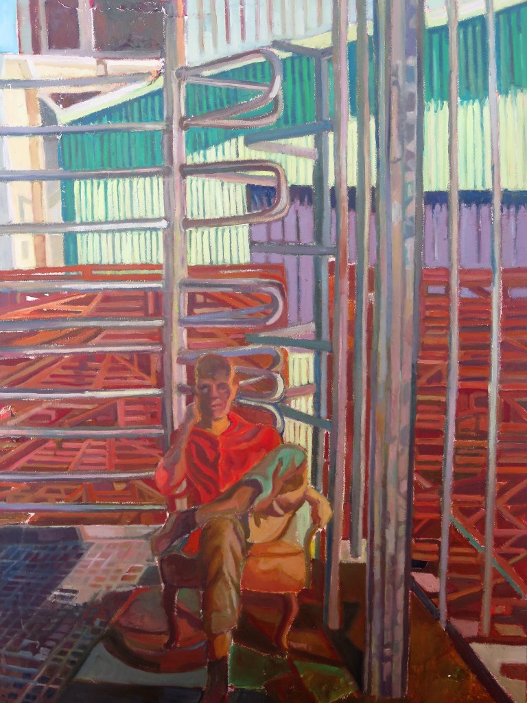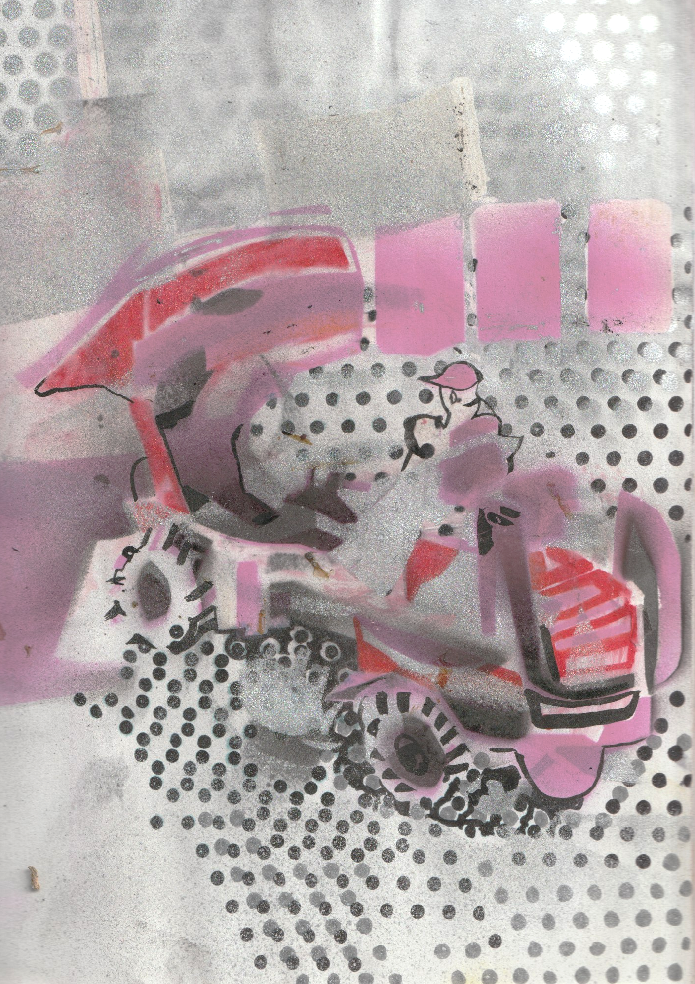 - C’est au spray en tamponnant au pinceau en imprimant au rouleau que les structures de métal laissent leurs empreintes sur la toile ou le papier , un geste très masculin.