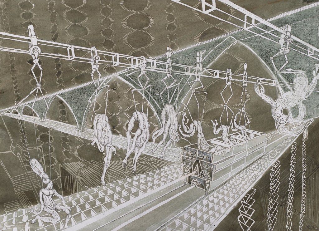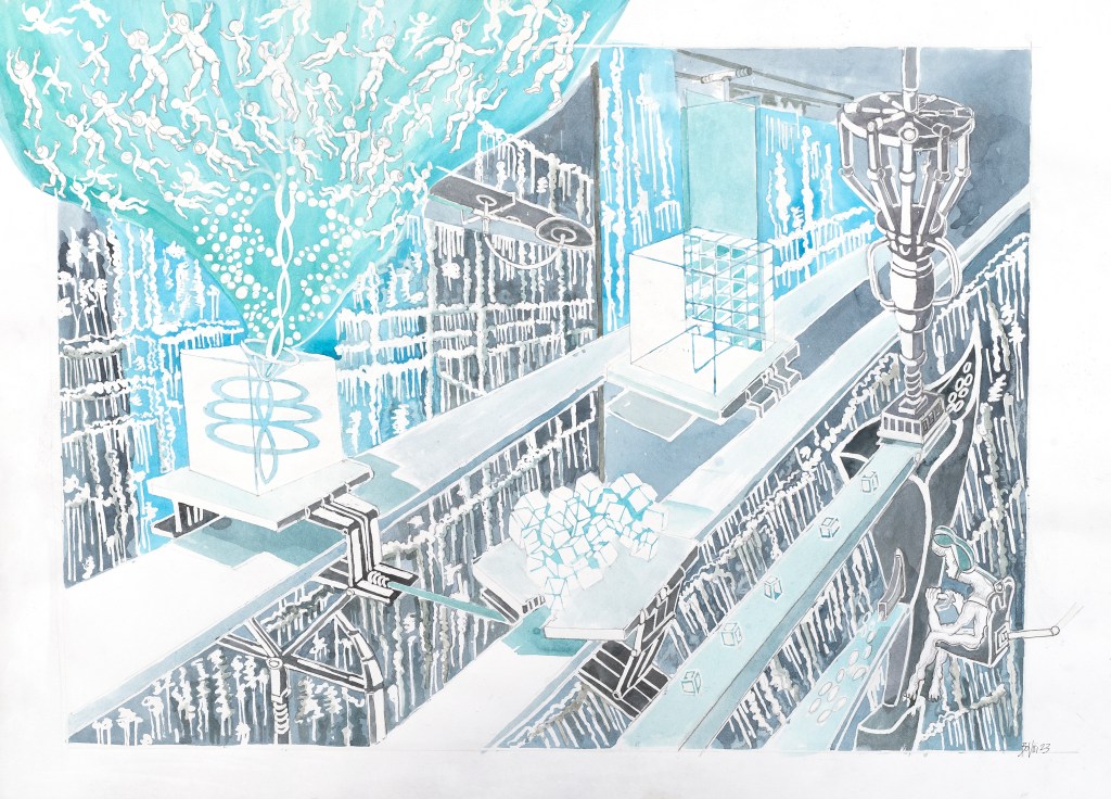 - Cette technologie ancestrale se concrétise dans le déroulement de l’univers d’Exo, le lecteur est plongé dans les méandres de lieux technologiques et de salle d’usinage, et de transformation.
