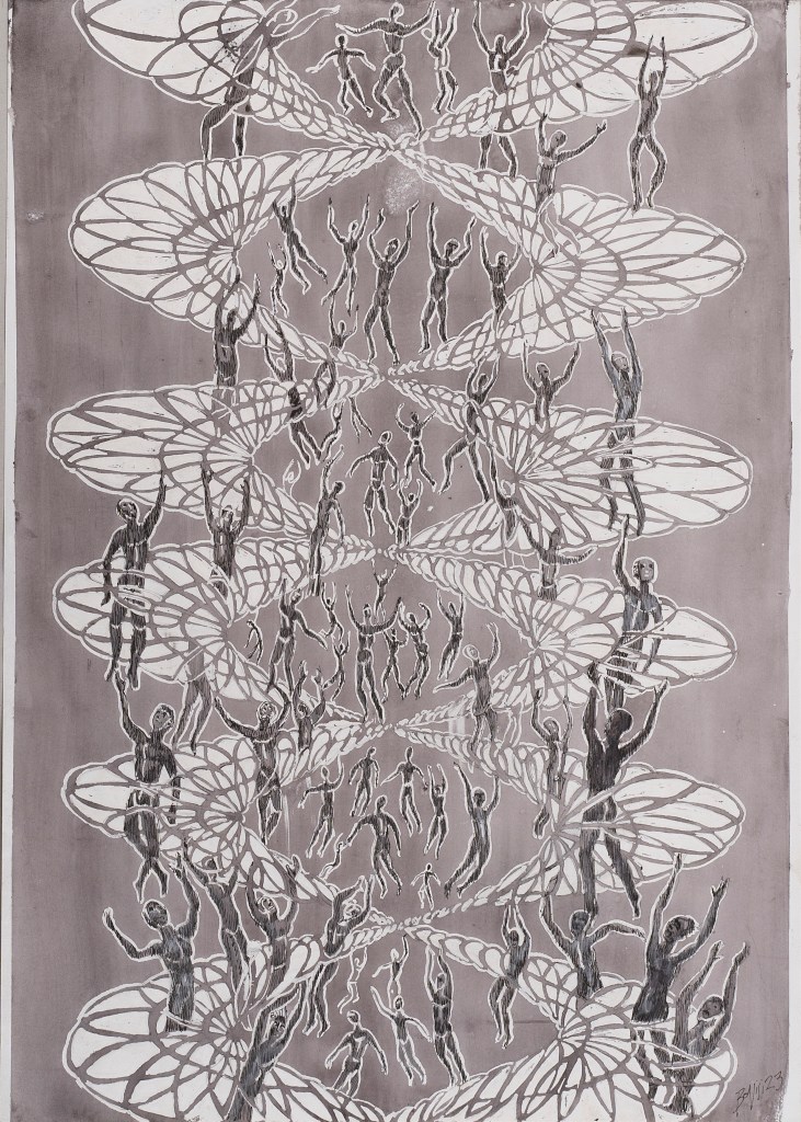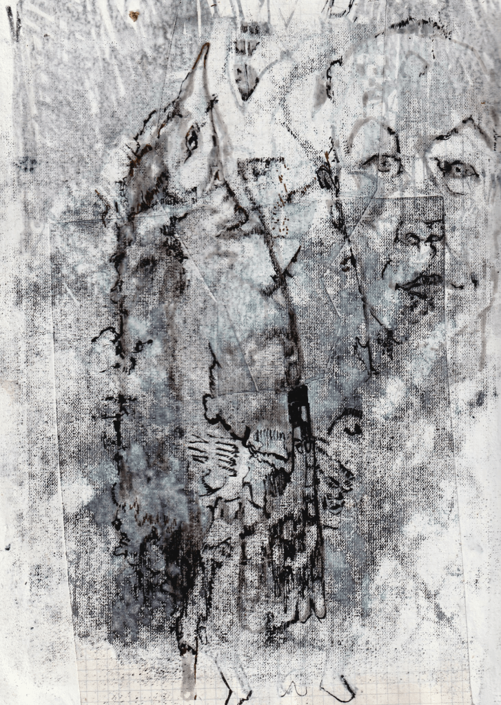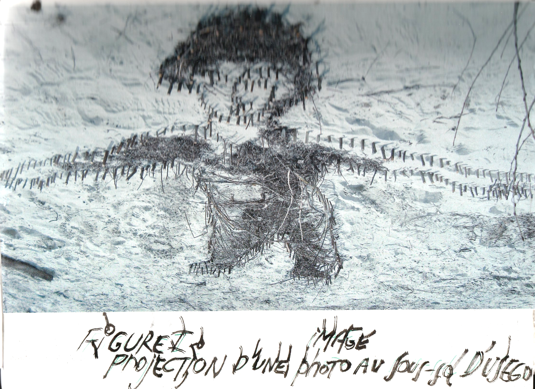 - Dès les années 2010, j’ai élaboré des dessins en projetant sur papier des ombres de figurines en fil de fer au moyen de spots lumineux. Ces ombres dessinées à la mine de plomb laissent peu à peu apparaître des personnages fantomatiques.