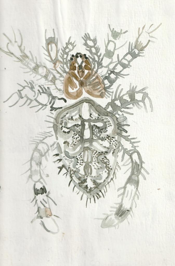 - L’ombre glisse sur la toile révélant son réseau d’armatures tressées.