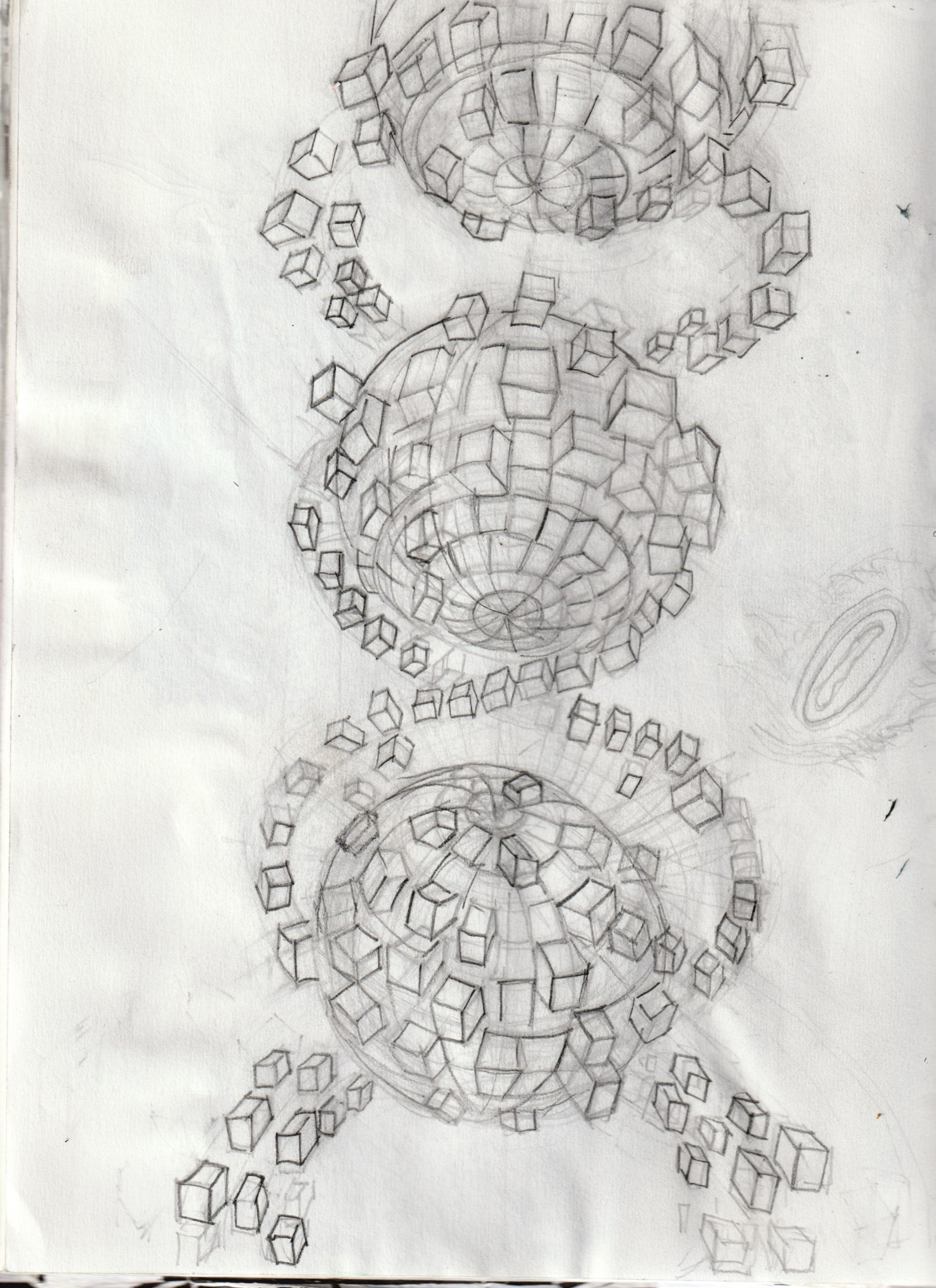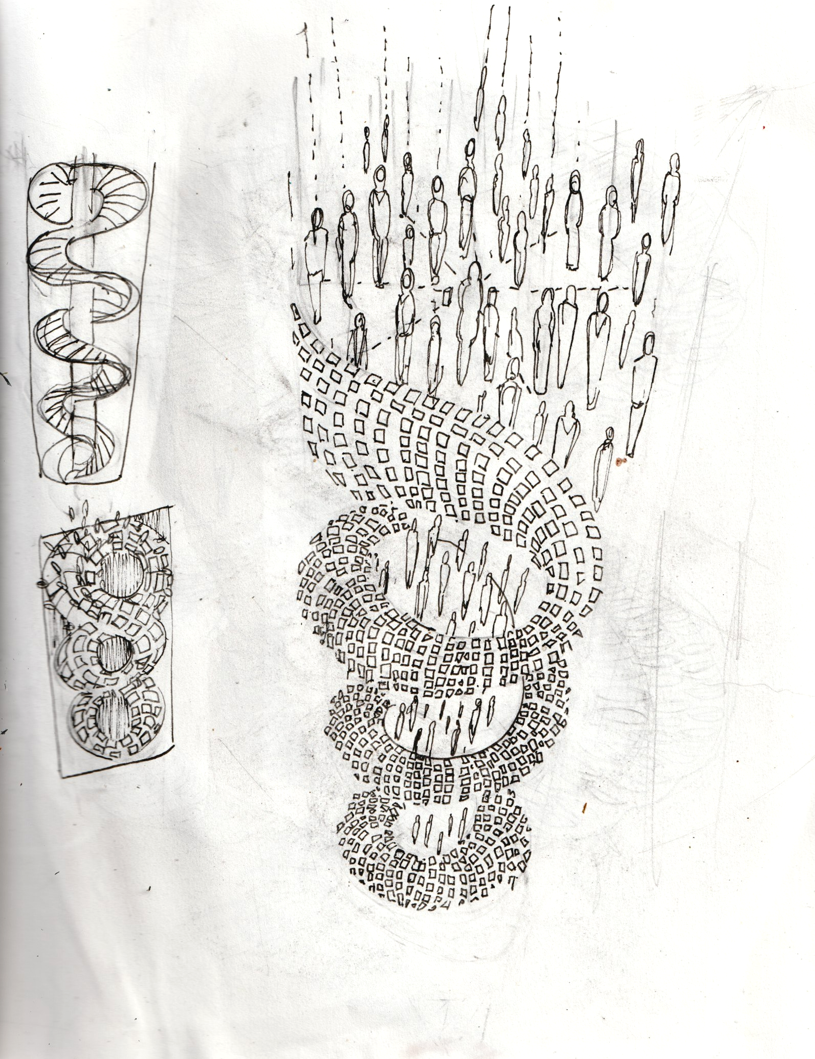 - S’inspirer de l’escalier à « double hélice » du château de Chambord , plier l’espace, afin de l’agrandir; y faire tournoyer, une flotte d’humanoïdes qui traversent des membranes alvéolées. Jouer avec l’organique et le géométrique.